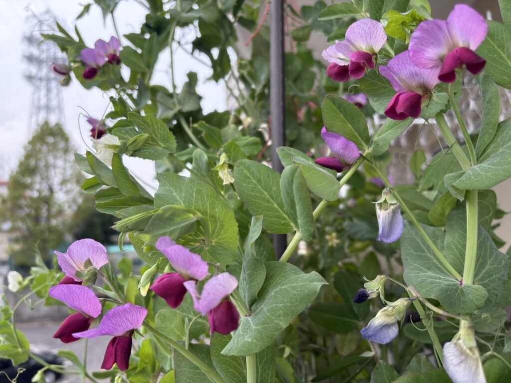2026年4月25日、我が家のベランダで赤花の絹さやえんどうが満開に。ぐっと華やかな景色になりました。(撮影:tabi-fa)