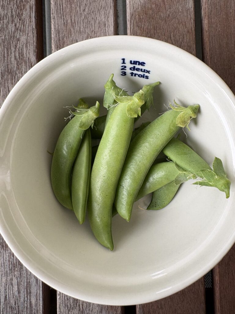 白花の絹さやえんどうを収穫。こんなに取れたよ。採れたてで新鮮そのもの。(撮影:tabi-fa)