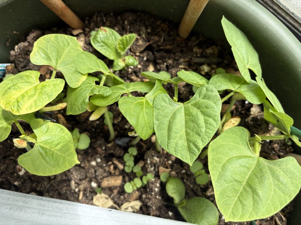 2026年3月25日。インゲンの芽が出てきました。双葉が開いて、本葉もこれからというタイミング。少し混み合っているので、これから間引いていく予定です。(撮影:tabi-fa)