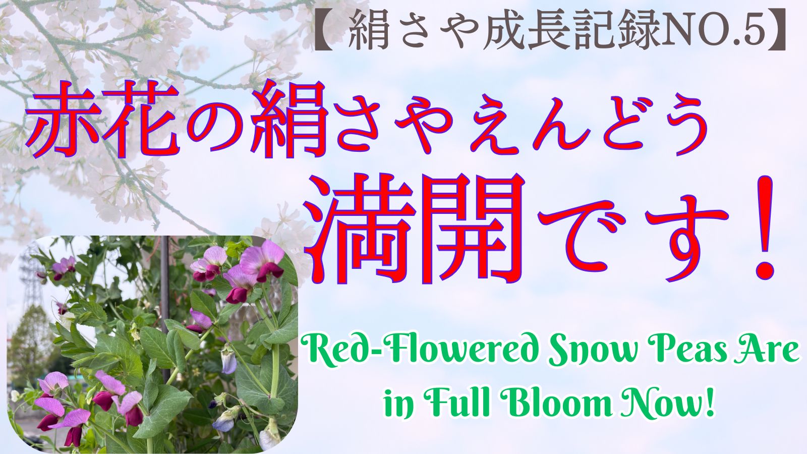 赤花のきぬさやえんどうは満開。