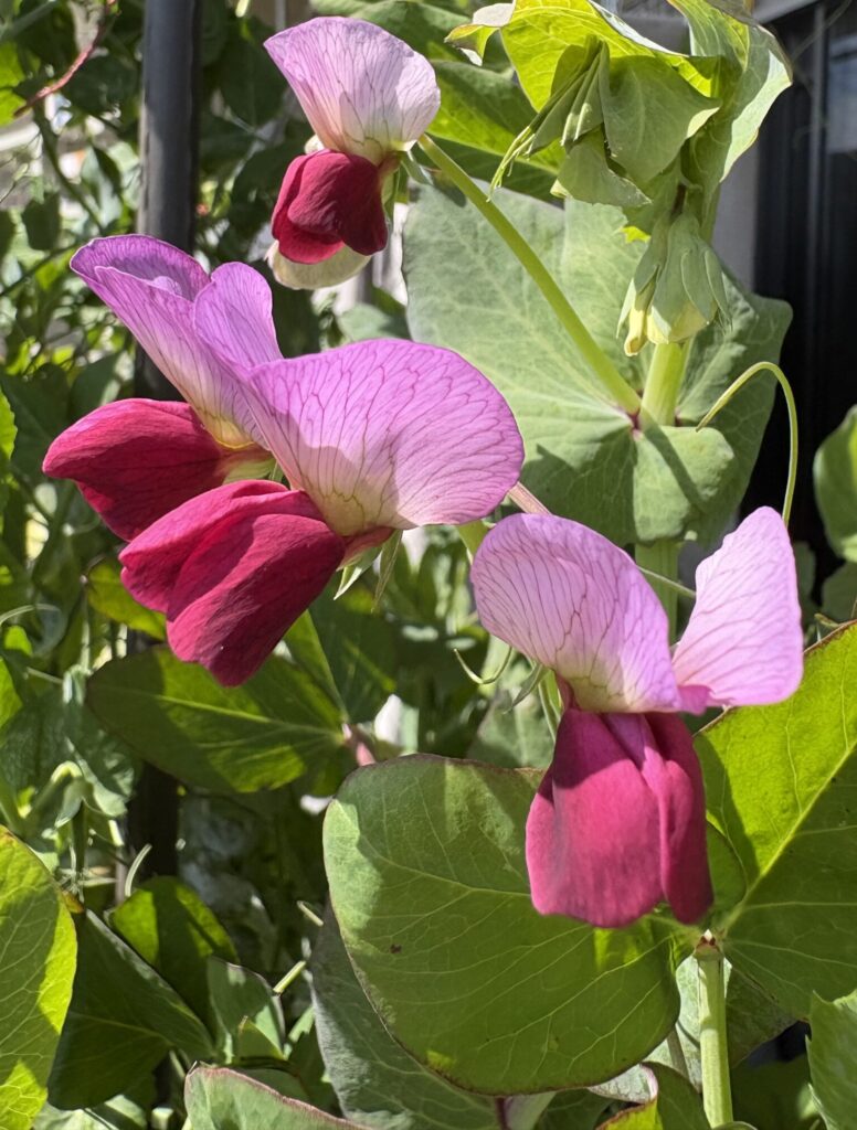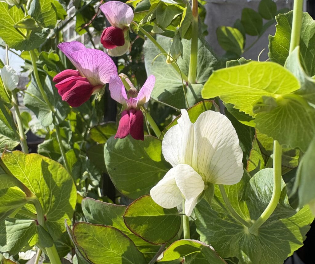 同じ鉢に植えた白花の絹さやえんどうも並んで咲いていて、対照的な優しい白色が赤花を引き立てます。面白いのは、花が咲くタイミングが1〜2か月ずれていること。