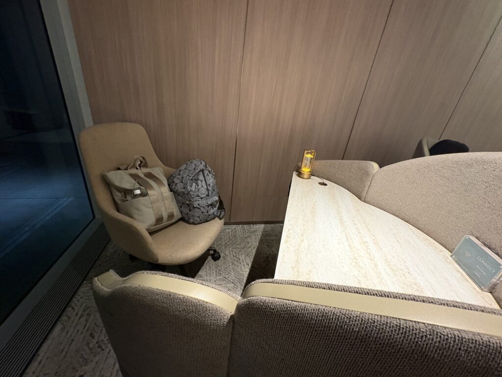 非常に広いラウンジで、奥のエリアに進むと、大きめのソファーや、深くリクライニングできるチェアーがあります。完全に寝転がるタイプではありませんが、角度が絶妙で、足を伸ばしてかなり楽な姿勢が取れます。
