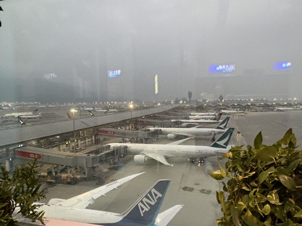 ここはただ滑走路が見えるだけの場所ではありません。眼下には並ぶ機材、そしてその向こうには香港の地形そのものが広がります。港、街並み、山の稜線、海、そして橋まで。空港の中にいながら、香港という土地のスケールを一望できる特別な眺め。