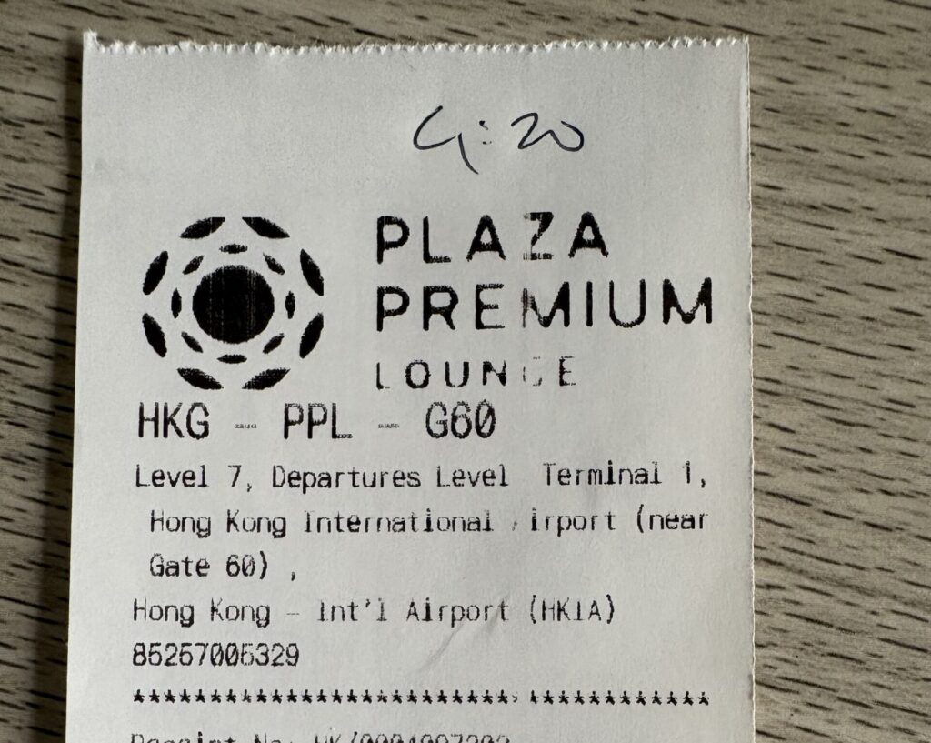 プラザプレミアムラウンジでは、受付時に利用可能な終了時刻がレシートに手書きで記入されます。写真の例では「7pm」や「4:20」と書かれており、その時間まで滞在できるという意味です。ラウンジでは抜き打ちでスタッフによるチェックがあり、このレシートを提示して利用時間内かどうか確認されます。