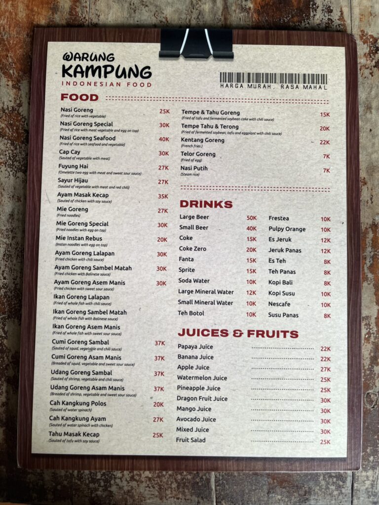 お料理はだいたい3万ルピア(約300円)以内、フレッシュジュースは約2万2千ルピア(約220円)で楽しめる、とってもお手頃。(撮影:tabi-fa)