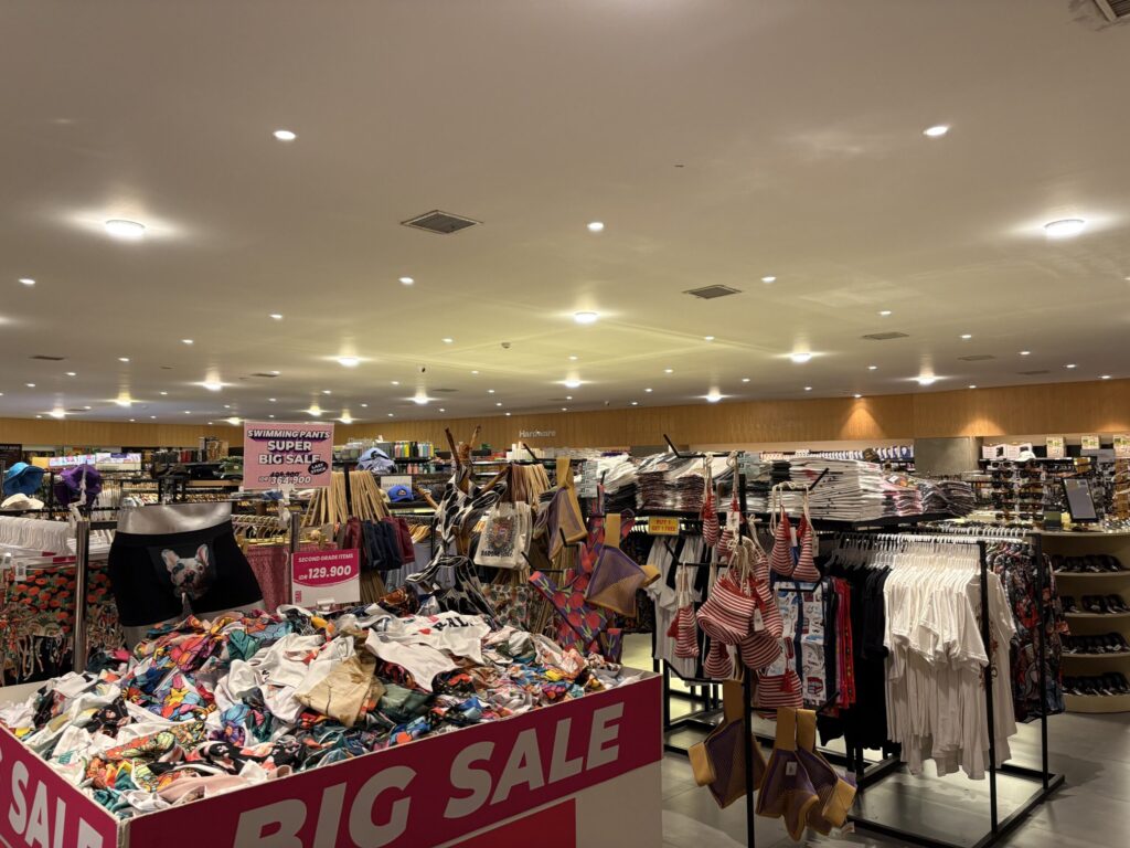 2階は衣類やお土産、雑貨などが並ぶフロア。セールもあってローカルスーパーっぽい雰囲気だけど、価格はやっぱり観光地寄り。