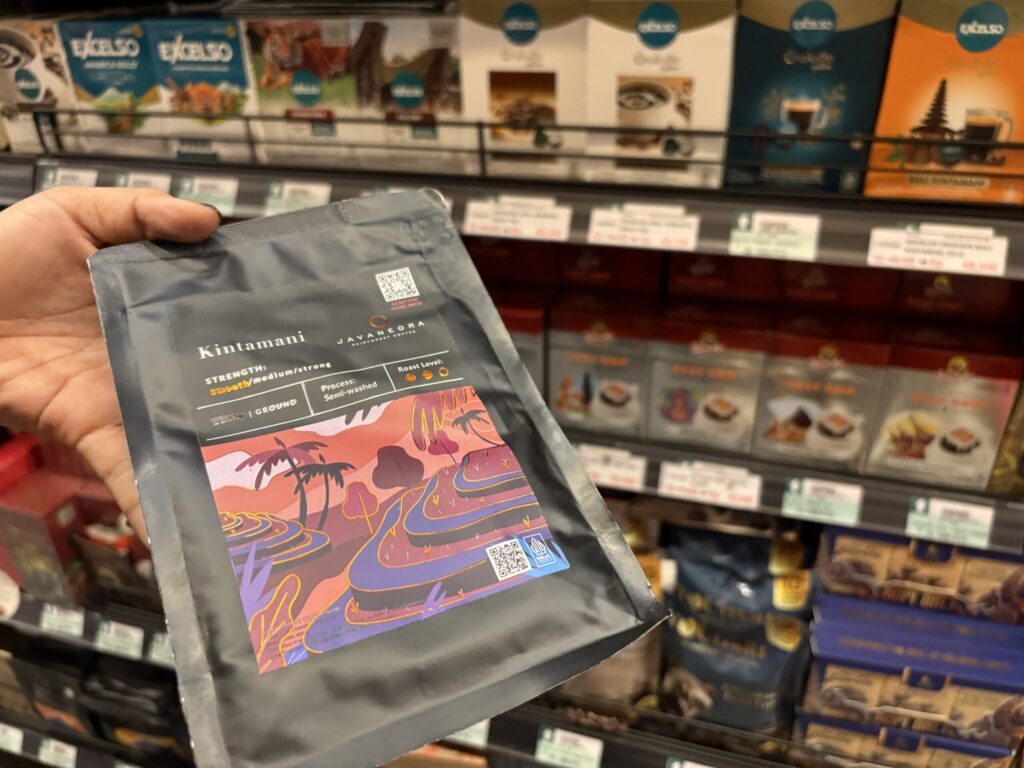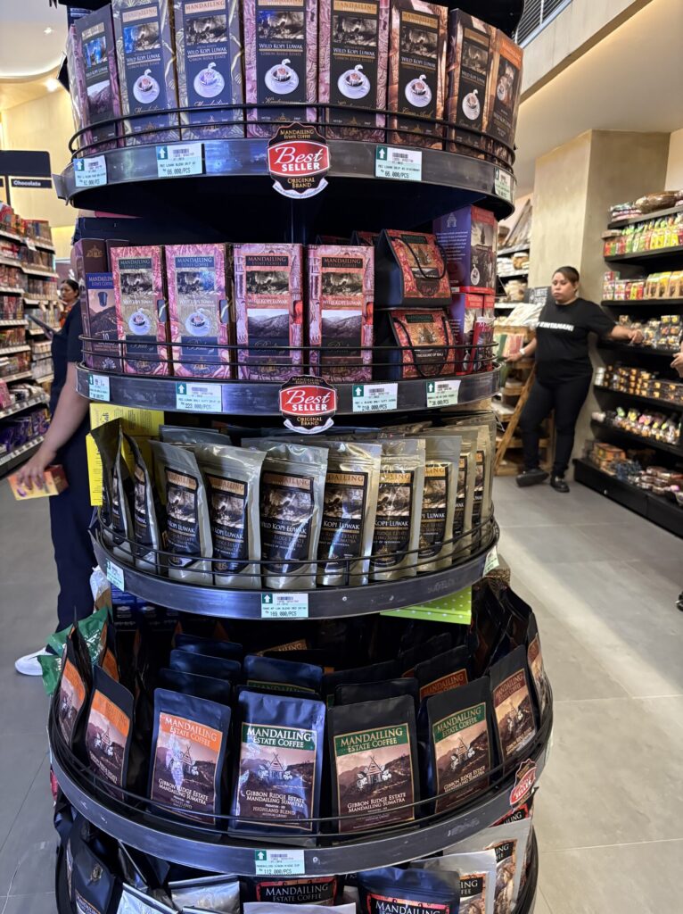 バリ名物のコーヒーがずらり。売り子さんもたくさんいて、いかにも観光地のコーヒーコーナーという雰囲気。