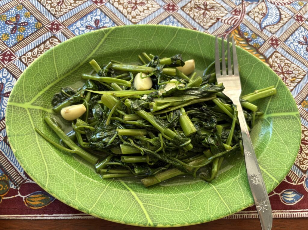一緒に頼んだのが 空芯菜のガーリック炒め15,000ルピア