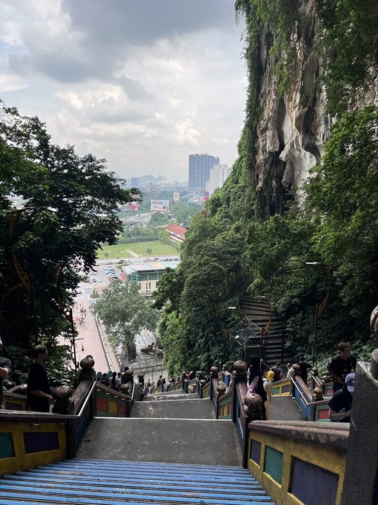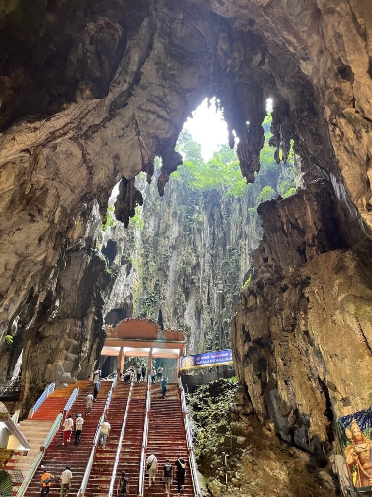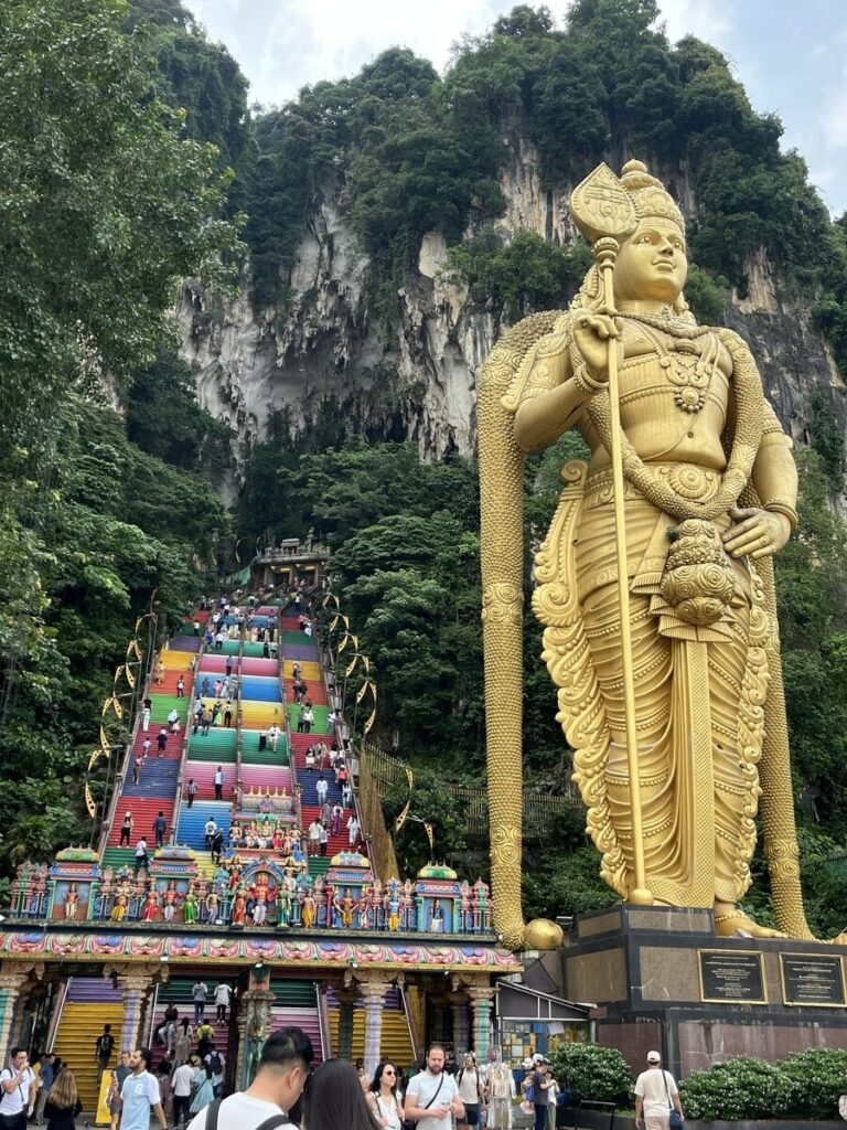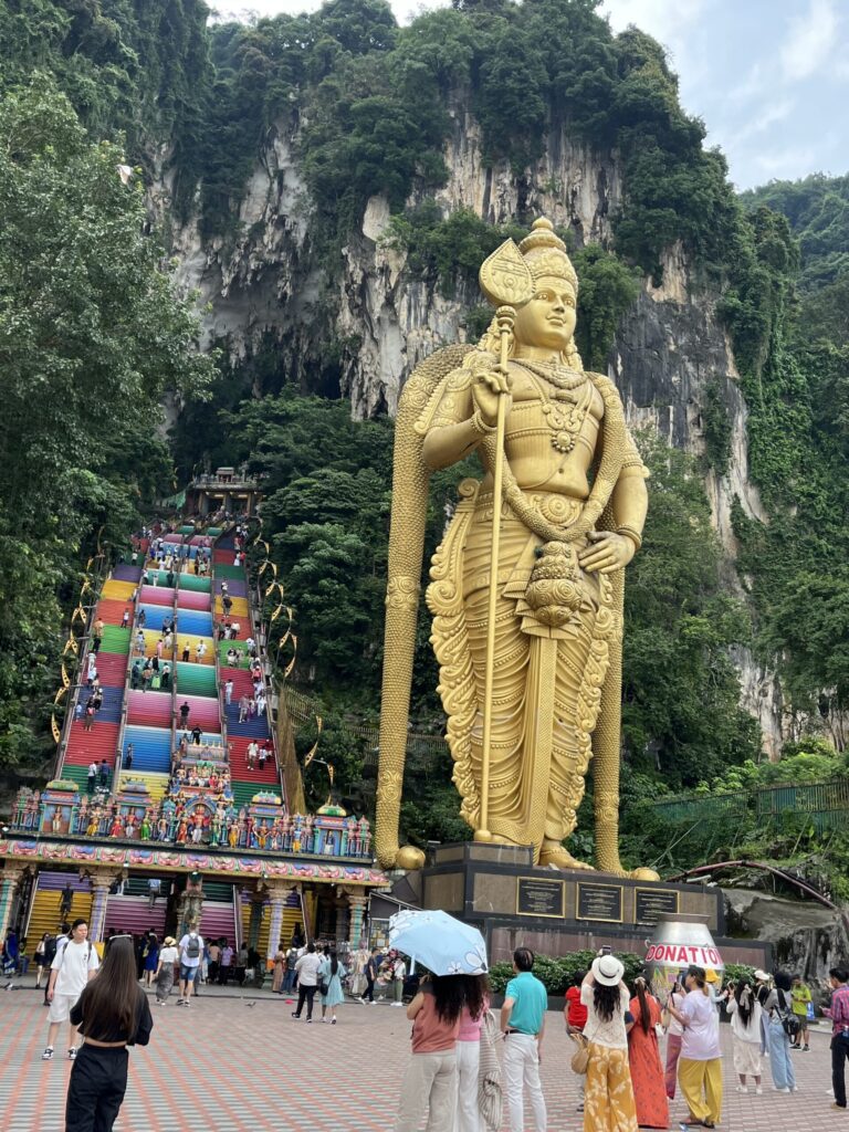 クアラルンプール市内から電車で行けるヒンドゥー教の聖地。洞窟の入口には、高さ42.7mもの黄金のムルガン神像が立ち、その後ろにカラフルな272段の階段が続いています。