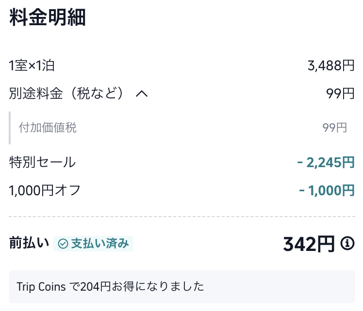 今回の宿泊費、実際に払ったのは342円。
